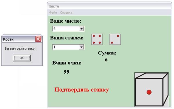 Если сумма выпавших цифр меньше 7 и играющий задумал число меньшее 7, он выигрывает сделанную ставку. Если сумма выпавших цифр больше 7 и играющий задумал число большее 7, он также выигрывает сделанную ставку. Если играющий угадал сумму цифр, он получает в четыре раза больше очков, чем сделанная ставка (рис.1. Приложение А).