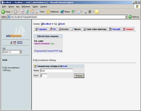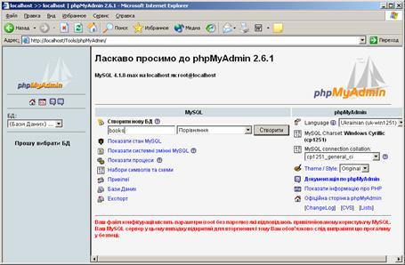 Створення бази даних починаємо відкривши сторінку за адресою http://localhost/Tools/phpMyAdmin/.Базу даних називаємо books. Створити. На мові SQL: CREATE DATABASE `books`;