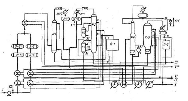 К-1 - отбензинивающая колонна; К-2 - атмосферная колонна; К-3 -отпарная колонна; К-4 - стабилизатор; К-5 - вакуумная колонна; Э-1 - Э-4 - электродегидраторы; П-1, П-2 - печи; КХ-1 - КХ-4 - конденсаторы-холодильники; Е-1, Е-2 - рефлюксные емкости; А-1 - пароэжекторный вакуум-насос;