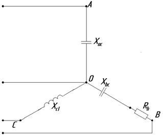 В трехфазную четырехпроводную сеть с линейным напряжением 220 В включен звездой несимметричный приемник, сопротивления которого равны: Xca