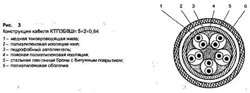 Конструктивные параметры соответствующих марок герметизированных и не герметизированных кабелей унифицированы. Кабели содержат четыре медные жилы со сплошной полиэтиленовой изоляцией, скрученные в звездную четверку с шагом не более 150 мм и 170 мм. В четверке две жилы, расположенные по диагонали, образуют пару. Изоляция обеих жил первой пары имеет натуральный цвет, второй пары - синий цвет. Поверх скрученного сердечника накладываются последовательно поясная изоляция в виде трубки из полиэтилена и экран из алюминиевой отожженной ленты с перекрытием не менее 10%. Под экраном должна быть проложена продольно медная луженая проволока диаметром 0,3-0,4 мм. Свободный объем под поясной изоляцией герметизированных кабелей заполнен гидрофобным компаундом, который вводится в сердечник одновременно с наложением поясной изоляции. Поверх экрана накладываются: в небронированных кабелях - трубчатая полиэтиленовая оболочка, в бронированных - КСГШБ - броня из стальной ленты с битумным покрытием, в кабелях КСППК - ПВХ лента, оцинкованные круглые стальные проволоки и защитный полиэтиленовый шланг. Самонесущие кабели имеют встроенный несущий трос в общей оболочке с сердечником, образующий конструкцию «восьмерка».