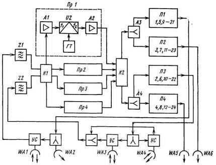 выполняют так, чтобы получить максимальную пропускную способность. В полосе 500 МГц, отводимой на один ИСЗ, можно разместить спектры сигналов 12 стволов. Обычно полоса ствола –36 МГц, а ЗЧИ между стволами – 4 МГц. Чтобы увеличить вдвое емкость ретрансляторов, вдвое уменьшают разнос между несущими соседних стволов, а необходимую развязку между перекрывающимися по спектру сигналами получают за счет поляризации. Для всех нечетных стволов (рис 5,а) берут, например, вертикальную поляризацию (ВП), а для четных – горизонтальную (ГП). Напомним, что применение линейной поляризации возможно в ИСЗ с жесткой стабилизацией на орбите. В той же полосе частот передают сигналы телеметрии (ТМ). Ретранслятор (рис. 5,6) имеет шесть антенн, причем WA1, WA2 и WA6 работают с волнами вертикальной поляризации, WA3, WA4 и WA5 – горизонтальной, где антенны WA1, WA3, WA5, WA6 –глобальные; WA2, WA4 –узконаправленные. Устройства совмещения (УС) служат для разделения волн приема и передачи. Итак, на ПФ Z1 приходят сигналы нечетных стволов. Оттуда они поступают в приемник Пр1, а затем через разветвитель A3 в передающие комплекты Ш и П2 и в антенны. Сигналы четных стволов проходят через ПФ Z2, приемник Пр2, передающие комплекты ПЗ и П4 и поступают в антенны. Минимальный частотный разнос между сигналами передатчиков, подключенных к одной антенне, составляет 80 МГц. Приемник содержит МШУ А1, смеситель UZ, ГТ и УСВЧ А2. В ретрансляторе применено однократное преобразование частоты. Переключатели К1