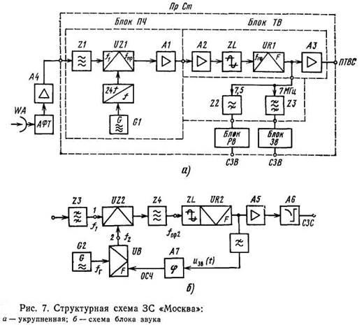 (рис. 7) содержит антенну WA, АФТ, МШУ А4 и приемную стойку Пр. Ст. В составе приемной стойки показан блок ПЧ и блок ТВ, фильтры для разделения ЧМ сигналов, передаваемых на поднесущих частотах 7 и 7,5 МГц, блок Зв для выделения СЗС и блок Рв для выделения СЗВ. Блок ПЧ предназначен для преобразования частоты входного сигнала в смесителе UZ1, который конструктивно совмещен с ПУПЧ А1. Блок ТВ содержит главный УПЧ А2, частотный демодулятор, состоящий из АО ZL и ЧД UR1, и выходной усилитель A3. В схему A3 включены режекторные фильтры для подавления сигналов, передаваемых на поднесущих частотах 7 и 7,5 МГц. На выходе выделяют ПТВС.