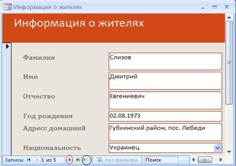 Это форма «Информация о жителях» в ней представлена вся необходимая информация о жителях (Фамилия, Имя, Отчество, Год рождения, Место рождения, Национальность). В красном кружочке стрелочкой указанна кнопка с помощью, которой можно перейти на следующую запись, зелёным – указанна кнопка перехода на последнюю запись, фиолетовым - указанна кнопка, с помощью которой можно добавлять записи в форму.