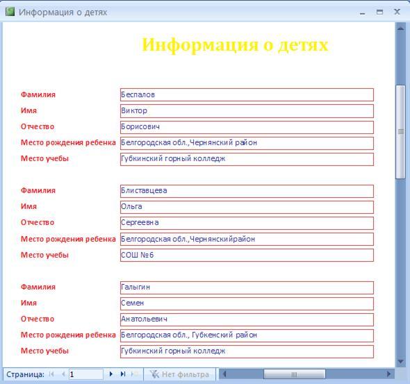 · выбор необходимой информации (ФИО ребенка, название учебного учреждения в котором он обучается, и место нахождения этого учебного заведения);