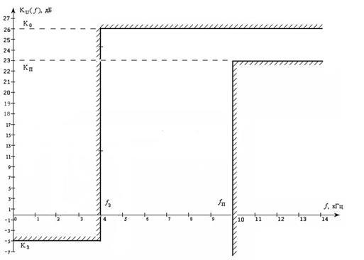 Спроектировать фильтр верхних частот (ФВЧ) с аппроксимацией амплитудно-частотной характеристики (АЧХ) полиномом Баттерворта, определить необходимый порядок фильтра, если заданы параметры АЧХ (рис.1): К0