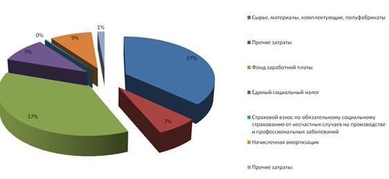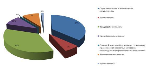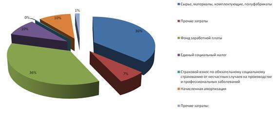 В текущем году затраты на производство продукции составили 13000 тыс. руб., из которых большую долю (84,62%) занимают затраты на сырье и материалы, 15,38% - прочие затраты.