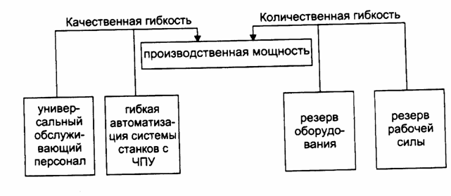 Запас производственной мощности возникает при наличии качественной и количественной гибкости производственных систем. Качественная гибкость