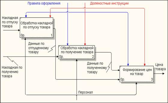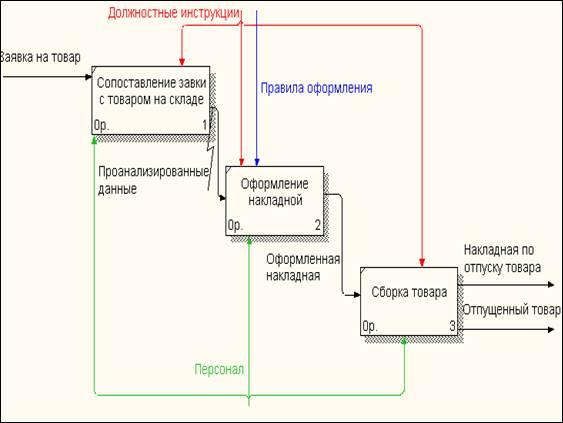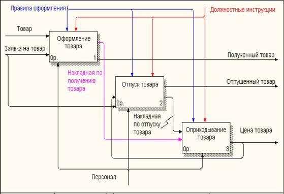 . Для изучения бизнес-процессов «Формирование заказа поставщика», «Получение товара», «Отпуск товара», рассмотрим диаграммы которые представлены в виде IDEF0 диаграмме. IDEF0 система представляется как совокупность взаимодействующих работ или функций.