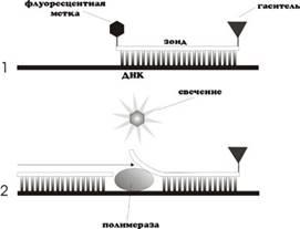 Данная методика основана на использовании 5'-экзонуклеазной активности полимеразы. В реакционную смесь добавляют ДНК-зонды, в состав которых входит флуоресцентная метка в 5'-положении и гаситель флуоресценции в 3'-положении, а также фосфатная группа в 3'-положении. Эти зонды имеют места посадки внутри амплифицируемой области. Гаситель поглощает испускаемое флуоресцентной меткой излучение, а фосфатная группа в 3'-положении блокирует полимеразу (Рис. 1) В ходе ПЦР во время стадии отжига праймеров происходит присоединение ДНК-зонда к комплементарной цепи ДНК, причем чем больше продуктов амплификации образуется в ходе ПЦР, тем больше молекул зондов свяжется с соответствующими ампликонами. Во время стадии элонгации полимераза синтезирует комплементарную цепь ДНК и при достижении зонда начинает его расщеплять благодаря наличию 5'-экзонуклеазной активности. Таким образом происходит разъединение флуоресцентной метки и гасителя, что приводит к увеличению детектируемого свечения [13]. Очевидно, что чем больше ампликонов было наработано в ходе ПЦР на данный момент времени, тем интенсивнее будет свечение[19].