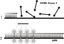 Этот способ детекции основан на том факте, что флуоресценция бромистого этидия и SYBR Green I значительно возрастает при их внедрении в двухцепочечные молекулы ДНК [14] (Рис. 4). Таким образом, можно наблюдать за накоплением продуктов амплификации. Очень важно отметить то, что увеличение флуоресценции может быть связано как с накоплением специфического продукта, так и неспецифического (праймеры-димеры, шмер). Для получения корректных результатов необходимо дополнительное изучение полученных ампликонов с помощью построения так называемых "кривых плавления".