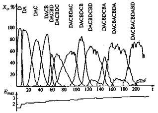 Показано, что на Праземле действительно установились перечисленные выше физические условия. Под воздействием ультрафиолетового излучения, высоких температур и электрических разрядов, выступавших в качестве источников свободной энергии, в восстановительной про-тоатмосфере, содержавшей водород, азот, водяной пар, метан, аммиак, двуокись углерода и т. д., могли образовываться аминокислоты, пиримидиновые и пуриновые основания, сахара, жирные кислоты и т.д. Следовательно, структурные компоненты биомолекул могли возникать спонтанно и в достаточных количествах. Показано также, что в этих условиях могла происходить полимеризация аминокислот в простейшие «заготовки» протеинов — так называемые протеноиды — и полимеризация нуклеотидов в более или менее длинные цепи. Под нуклеотидами мы понимаем основные структурные единицы нуклеиновых кислот, состоящих их пуриновых (аденина и гуанина) или пиримидиновых (цитозина, тимина к урацила) оснований, а также пентоз и фосфатных групп. Эти еще примитивные протеноиды и нуклеиновые кислоты образовывались преимущественно в водах, омывавших Праземлю. В свою очередь из них (главным образом из протеноидов) возникали компактные образования — так называемые коацерваты. Решающее значение имело то, что протеноиды обладали простыми каталитическими свойствами, хотя те были выражены в миллионы раз слабее, чем у современных ферментов. При каталитической поддержке протеноидов синтез полинуклеотидов должен был происходить интенсивнее, причем уже имевшиеся цепочки нуклеотидов служили матрицами для синтеза последующих цепочек. Таким или близким к описанному путем протополимеры обрели способность к самовоспроизведению. В результате ошибок при репродуцировании возникали все новые и новые структуры, которые в результате естественного отбора вступали между собой в конкуренцию. Выживали только такие, которые лучше всего приспосабливались к окружающей природной среде, обладали способностью к быстрому и относительно стабильному воспроизведению. На рис. 3 представлена формальная схема замещения структур нуклеиновых кислот новыми, все более совершенными. К строгому изложению предложенной Эйгеном концепции ценности мы сможем приступить лишь в последующих разделах. Упомянем пока лишь некоторые качественные аспекты. Способность нуклеиновых кислот к хранению информации (способность, в основе которой лежит мультистабильность первичных структур нуклеиновых кислот), несомненно, играет важную роль при определении «ценности» конкретной первичной структуры для процесса эволюции. «Ценность» с этой точки зрения должна быстро возрастать с увеличением длины v последовательностей и, следовательно, их информационной емкости W= λv