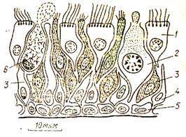 Рис.1 Строение обонятельной выстилки: 1 – ресничная клетка; 2 – грушевидная секреторная клетка; 3 – обонятельные луковицы; 4 – опорные клетки; 5 – базальные клетки; 6 – бокаловидная секреторная клетка.