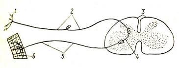 1 – кожный рецептор; 2 – афферентное волокно; 3 – спинной мозг; 4 – вставочный нейрон; 5 – эфферентное волокно; 6 – мышца.