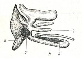 1 – желудок; 2 – пилорические придатки; 3 – селезенка; 4 – кишечник; 5 – желчный пузырь; 6 – печень.