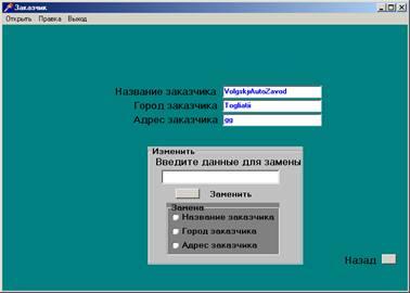 Четвертая форма называется “Заказчик” (рис. 4). Она позволяет просматривать, редактировать информацию о заказчике, т.е. об АО “АвтоВАЗ”.