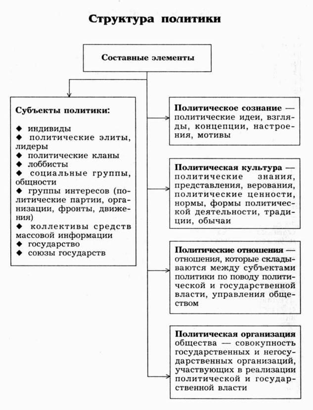 В структурном плане политика представляет собой единство, по меньшей мере трех элементов: политические отношения (связи между социальными субъектами и их деятельность по поводу власти), политические институты (организации и учреждения, регулирующие политические явления), политическое сознание (взгляды, идеи, мнения, чувства, настроения, отражающие реальное политическое бытие).
