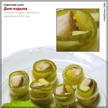 Начнем же делать суши. Первым номером возьмем какой-нибудь простой рецепт с минимумом компонентов. Ломтик вареного картофеля объединим с ломтиком жареной куриной котлеты, обернем в тонкий продольный лепесток соленого огурца и закрепим колечком репчатого лука. Мы назвали этот рецепт «Дом отдыха». Отведайте его, обмакнув в основной соус, и прикройте глаза... разве не начинает казаться, что вы сидите в столовой простого советского дома отдыха в средней полосе России?
