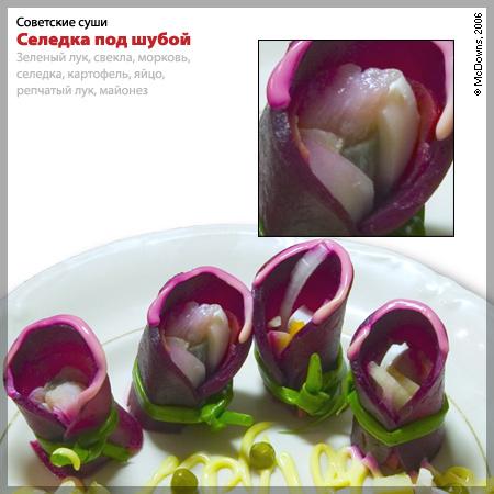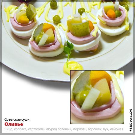 Далее, конечно же, два рецепта, без которых (в несколько иной форме) не обходится ни одно советское застолье. Конечно же, это «Оливье» и «Селедка под шубой». Думается, что всем прекрасно известны рецепты этих блюд, и потому каждый с легкостью приготовит эти суши по своему вкусу (например, мы не добавляли в селедку свежее яблоко, а многие считают это немыслимым). Обратите внимание, в этих двух рецептах используется майонез, хотя мы не слишком одобряем этот французский соус.