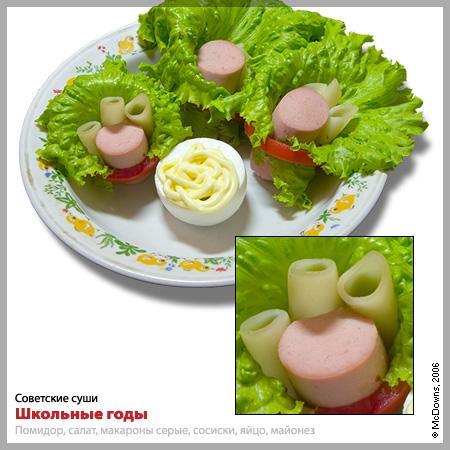 А вот рецепт «Школьные годы», также крайне незамысловатый. В лист свежего салата заверните три макаронины (толстые, серые, настоящие советские!) и треть вареной сосиски. Закрепите помидорным колечком. Мы дополнили блюдо яйцом под майонезом, но можно этого и не делать.