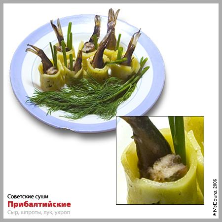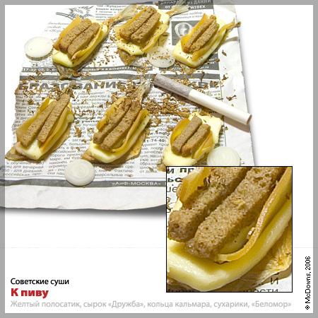 И наконец, несколько своеобразный рецепт: суши «К пиву». На половинку расплющенной тушки желтого полосатика уложите кусочек плавленного сыра «Дружба» (мы настаиваем именно на этом сорте!), на сыр — два сухарика по вкусу, а по бокам от сухариков поместите два ломтика от вяленого кольцами кальмара. Все это необходимо (!) посыпать табаком из папирос «Беломор». Данные суши можно макать в девятую «Балтику» и запивать надлежит ей же. Поэтому для натур эстетствующих данный рецепт не подходит.