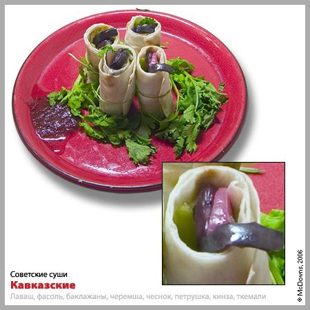 Богатейшей кавказской кухне посвящены суши «Кавказские», самые сложные в приготовлении. Обжарьте кольца баклажана в растительном масле с солью и пряностями по вкусу. В аккуратно вырезанную полоску армянского лаваша заверните жареный баклажан, аккуратно уложите сверху зерна вареной красной фасоли и нарезанный зубчик маринованного чеснока. Прибавьте кусочек соленой черемши, пару листиков кинзы и заверните, после чего обвяжите подходящей по длине веточкой свежей петрушки. Уверяем вас, вся эта возня вполне оправдана! Вкус — фантастический. Подавайте с кинзой и соусом ткемали.