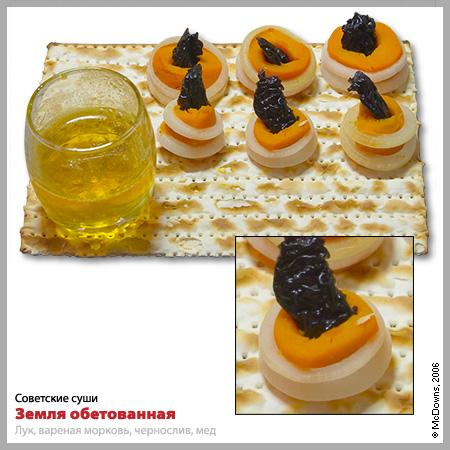 Мы не могли обойти своим вниманием и еще одну национальную кухню — еврейскую — и создали суши «Земля обетованная». Вареная морковь режется на порционные куски, затем вырезается ее сердцевина. В полученное отверстие помещается кусочек чернослива, а сверху на морковь надеваются два колечка репчатого лука. Суши подаются на маце и непременно со свежим медом. Эти суше не нужно макать в первые два соуса, а следует обмакивать в мед и заедать мацой. Очень вкусно!