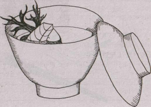 Практическое преимущество посуды с крышкой состоит в том, что пища дольше сохраняется в ней горячей. Кроме того, гости испытывают удовольствие от предвкушения нового блюда, за которым следуют удивление и восторг, когда крышку наконец-то открывают. (Только будьте осторожны, когда несете это блюдо, чтобы не нарушить красоту и не испортить впечатление.) Снимая крышку, вы доставляете гостям еще одно удовольствие — от обоняния аромата блюда. Для усиления аромата по поверхности супа часто пускают плавать красиво вырезанные кусочки кожуры японского лимона юдзу.