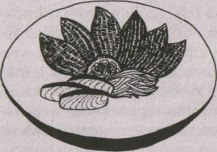 зрения, под которым смотрят на нее гости: если рыбу поместить точно в центр, будет казаться, что она лежит слишком близко к переднему краю чаши.) Далее на эту горку кладут крестнакрест полоски рыбы, перекрывая друг друга. Высота «кедра» зависит от посуды. На мелком блюде он возвышается, словно горный пик, а в глубокой чаше нерх находится чуть ниже краев, чтобы получился кедр, растущий в горной долине.