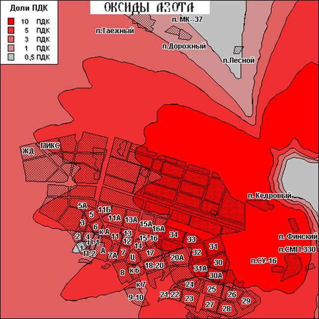 Наиболее загрязненными по показателю концентрации диоксида азота в городе являются следующие районы: пос. Кедровый, пос. Финский, микрорайоны - 31,30,25.