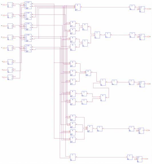 Багатоваріантний аналіз розв’язків поставленої задачі показав, що, для забезпечення оптимальної роботи пристрою, його потрібно робити комбінаційним. Розроблено принципову електричну схему та її логічну модель відповідно до поставлених вимог. Складено тест перевірки, який показав, що розроблений пристрій працює правильно. Розраховано швидкодію(найбільша затримка становить 95,9 нс) та апаратні витрати(34 базових комірок) для реалізаці. Виконано автоматичне та ручне трасування схеми пристрою. Схема електрична принципова була розроблена, промодельована та протрасована в середовищі OrCAD 9.1.