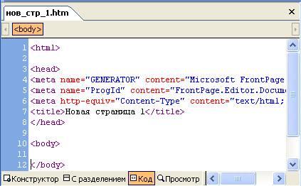 В режиме "С разделением" - на экране отображается Web-страница одновременно в режиме Код и в режиме Конструктор. В режиме просмотра Web–страница имеет вид аналогичный ее отображению в Web–браузере.