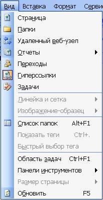 Команды, которые предназначены для работы с Web–страницами и Web–узлами, расположены в меню Вид программы FrontPage: