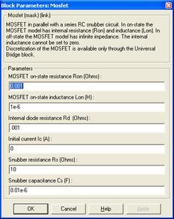 Окно настройки параметров силового полупроводникового модуля (Mosfet) показано на рисунке 12.