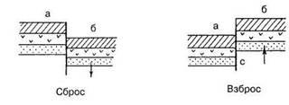 Разрывные дислокации образуются в результате интенсивных тектонических движений, сопровождающиеся разрывом сплошности пород и смещением слоев относительно друг друга. Амплитуда смещения может быть от нескольких сантиметров до километров при ширине трещин до нескольких метров. К разрывным дислокациям относятся сбросы, взбросы, грабены, горсты, сдвиги и надвиги (рис.: а – неподвижная часть земной коры, б – подвижная часть).