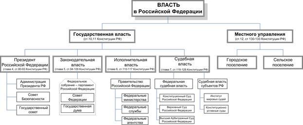 Согласно статье 11 Конституции РФ государственную власть осуществляют Президент РФ (он является главой государства, гарантом Конституции РФ, обеспечивает согласованное функционирование и взаимодействие органов государственной власти, в системе федеральных органов поставлен на первое место и не отнесён непосредственно ни к одной из основных ветвей власти), Федеральное Собрание (парламент Российской Федерации, её законодательный и представительный орган, состоит из двух палат — Совета Федерации и Государственной Думы), Правительство Российской Федерации (возглавляет систему органов исполнительной власти РФ), суды РФ — Конституционный Суд РФ, Верховный Суд РФ, Высший Арбитражный Суд РФ и другие федеральные суды (осуществляют судебную власть, в частности, правосудие).