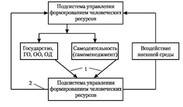 Для выявления условий развития представим систему формирования человеческих ресурсов в виде управляющего объекта (подсистемы управления формированием человеческих ресурсов) и управляемого (персонал) (рис.2). Управляющая система включает деятельность государства, гражданского общества (ГО), общественных организаций (ОО), общественных движений (ОД) и самостоятельную работу человека, персонала.
