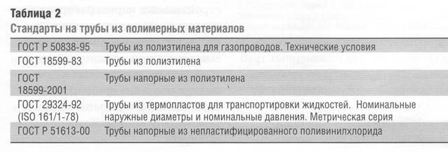 Законодательными документами для производства полимерных труб являются стандарты на трубы из полимерных материалов (табл. 2).
