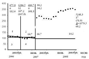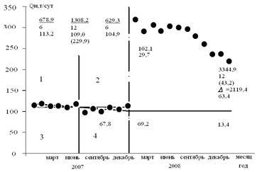 Динамика накопленной добычи нефти, жидкости и накопленной закачки воды приведена на рис. 57