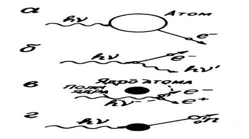 Фотоэффект (а), комптоновское рассеяние (б), образование пар (в),