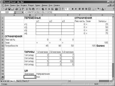 - В экранной форме (Рис. 15) в ячейках F3, F4, F5, F6, C8, D8, E8, B20 появится текущее значение, вычисленное по введенной формуле, то есть 0 (так как в момент ввода формулы значения переменных задачи нулевые).