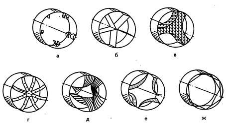 Рис.3 Общий вид внутрипечных теплообменников: а – пересыпающие лопасти, б – ячейковый металлический, в – ячейковый керамический, г – звеньевой, д – арочный, е – циклоидный, ж – цепной