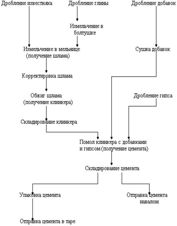 Сыр. шлам→перемешивание, хранение →печь обжига →клинкер →помол ПЦ клинкера→ отгрузка ж/д хопера 67-72 т., автоцементовозы 15-30 т., бумажные мешки 25-50 кг.