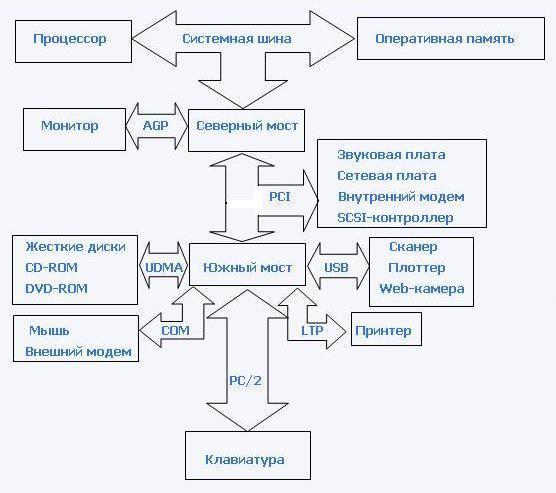 Быстродействие различных компонентов компьютера (процессора, оперативной памяти и контроллеров периферийных устройств) может существенно различаться. Для согласования быстродействия на системной плате устанавливаются специальные микросхемы (чипсеты), включающие в себя контроллер оперативной памяти (так называемый северный мост) и контроллер периферийных устройств (южный мост).