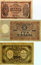 - серпень1919 року - 10 ("раки") та 1000 карбованців (ескізи І.3олотова), 100 карбованців (ескіз Г.Нарбута) та 250 карбованців ("канарейки", ескіз Б.Романовського)