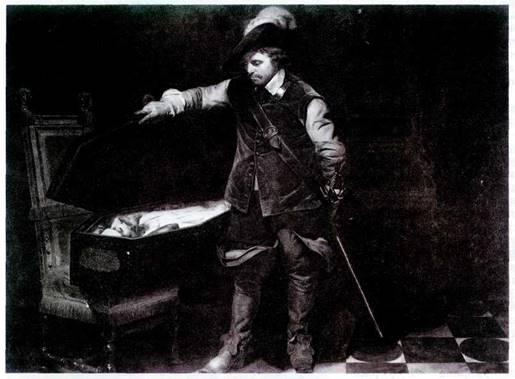 — обитое красным кресло для подсудимого... Но вот появился король в чёрном платье, окружённый 12 солдатами. В знак непризнания полномочий суда он нарочито не снимал шляпы. Не глядя по сторонам, Карл быстро прошёл и сел в предназначенное для него кресло спиной к публике...»