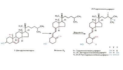 Наряду с парагормоном и кальцитонином в поддержании фосфорно-кальциевого гомеостаза большое участие принимает витамин D (D-гормон, холекальциферол или витамин D3), который при гидроксилировании в печени и почках образует гормон кальцитриол (1α,25-дигидроксихолекальциферол)