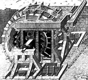 В эпоху Возрождения интерес к вечному двигателю был поистине огромен. Например, большое количество чертежей с описанием конструкции вечного двигателя было сделано архитектором Франческо ди Джорджио (Francisco di Georgio). Один из довольно неплохих вариантов мы видим на рисунке. Это гидроприводная мельница с дополнительной помпой.