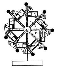 По внешнему виду эта модель мало чем отличалась от описанных выше устройств. Правда, в дополнение к откидывающимся грузам на концах звездообразно расположенных рычагов Фергюсон использовал еще набор грузов, передвигавшихся в особых каретках в направлении касательной к окружности вращения и перпендикулярно соответствующему рычагу. Одновременно перемещение грузов с помощью совокупности специальных блоков и тросов связывалось с движением откидывающихся рычажков; при этом каждый рычажок соединялся тросом с тем грузом, который отстоял от него по окружности на 90° в направлении движения часовой стрелки. С помощью подобной взаимной комбинации исходных элементов Фергюсон намеренно хотел усилить действие исследуемой машины, чтобы, если все попытки привести ее в движение окажутся безуспешными, наглядно показать, что идея перпетуум мобиле целиком принадлежит царству фантазии. Весьма вероятно, что модель Фергюсона была не единственным выступлением против самой сущности идеи вечного двигателя, поскольку с критикой разных типов этих машин мы встречаемся и в целом ряде других сочинений того времени.