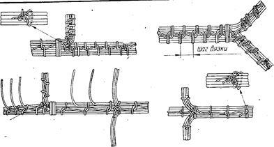 Вязку осуществляют в одну, две нитки и более с натяжением вручную или с помощью приспособлений. Для снижения трудоемкости процесс вязки жгутов механизируют, используя пневматические пистолеты [4], а иногда и автоматизируют, осуществляя вязку жгутов на специальных полуавтоматических станках. Последовательность вязки жгутов показана на рис. 10, а—д.